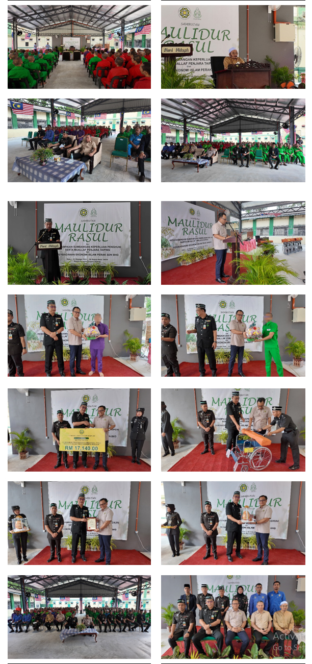 Majlis Penutup Sambutan Maulidur Rasul 1447H Peringkat Penghuni Penjara Taiping telah diadakan pada hari Rabu, 01 Oktober 2025 di Dewan Terbuka, Dataran Kedamaian, Penjara Taiping. Antara pengisian program ialah Alunan Selawat beramai-ramai kepada baginda Nabi Muhammad SAW, Sesi Ceramah Maulidur Rasul yang disampaikan oleh YBhg. Ustaz Mohamad Dininazmi bin Sabri, Penolong Pengurus Bahagian Syariah, Perbadanan Ekonomi Islam Perak dan Alunan Bacaan Ayat-ayat Suci Al-Quran oleh wakil penghuni. Seterusnya, Ucapan Aluan oleh YDh. PKK Rizalma bin Che’ Abd Hamid, Pengarah Penjara Taiping dan Ucapan Perasmian oleh YBrs. Tuan Amirul Hakim bin Abdullah, Ketua Pegawai Eksekutif, Perbadanan Ekonomi Islam Perak.