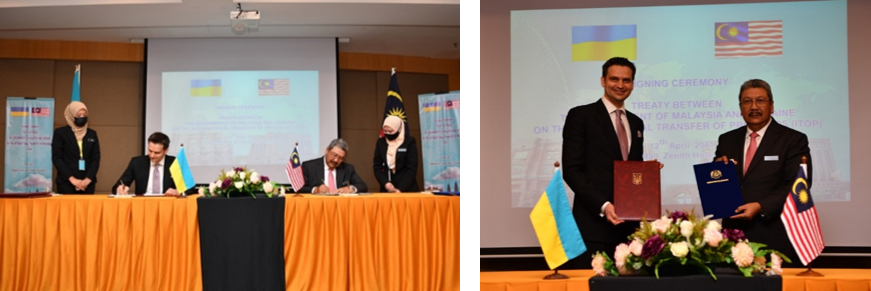 MJM berhubung urusan pemeteraian Triti ITOP Malaysia-Ukraine telah diluluskan oleh Jemaah Menteri pada 11 Disember 2020. Majlis Pemeteraian Treaty on International Transfer of Prisoners (ITOP) antara Kerajaan Malaysia dan Ukraine telah berlangsung pada 12 April 2021 di The Zenith Hotel, Putrajaya. Bagi pihak Kerajaan Malaysia, pemeteraian diwakili oleh YBhg Datuk Wan Ahmad Dahlan bin Haji Abdul Aziz, Ketua Setiausaha Kementerian Dalam Negeri, manakala bagi pihak negara Ukraine diwakili oleh TYT Olexander Nechytaylo, Duta Besar Ukraine ke Malaysia.