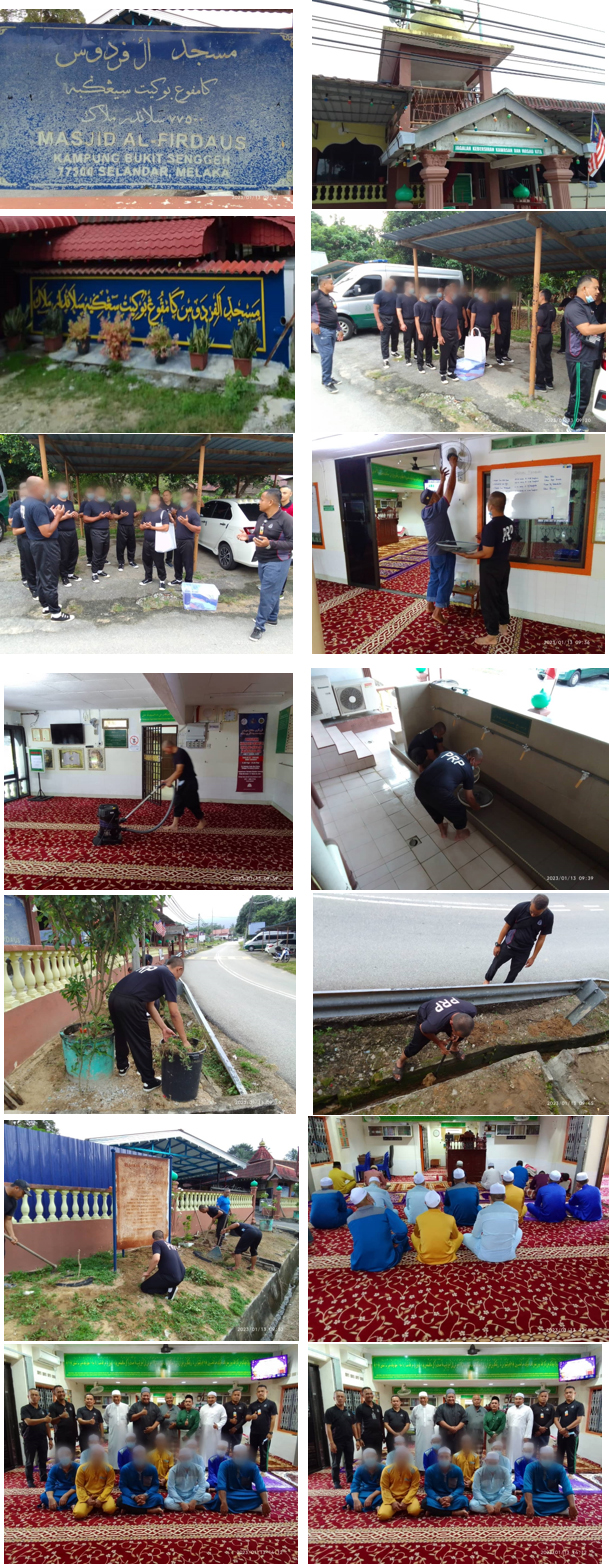 13 Januari 2023 (Jumaat), seramai (10) Orang DiSelia (ODS) dan (07) orang kakitangan Pusat Koreksional Jasin, Melaka telah terlibat dalam Program Khidmat Komuniti dan Solat Jumaat di Masjid Al-Firdaus Kampung Bukit Senggeh Selandar, Melaka. Program telah bermula jam 9.00 pagi dan berakhir sehingga selesai Solat Jumaat. Antara aktiviti utama adalah membersihkan kawasan persekitaran dalaman dan luaran masjid disamping bersua kenal menyambung silaturrahim dengan penduduk setempat. Program sebegini dapat melatih ODS untuk mengadaptasi diri dengan masyarakat luar apabila dibebaskan kelak.