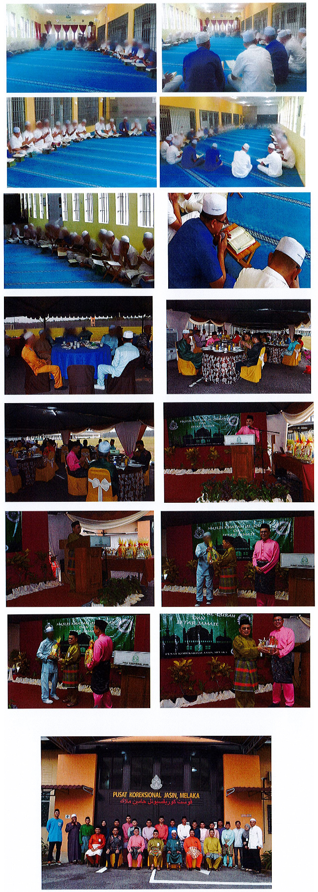 13 April 2023 bersamaan 22 Ramadan 1444H (Khamis), telah berlangsung Majlis Khatam Al-Quran dan Iftar Kamie Peringkat Penghuni bagi tahun 1444H/2023M. Program pada kali ini telah diserikan dengan kehadiran beberapa tetamu jemputan terdiri daripada Ketua-Ketua Institusi Penjara Negeri Melaka, Ibu Pejabat Polis Daerah Jasin, rakan-rakan strategik dari Lembaga Nenas Malaysia, Jabatan Pertanian Negeri Melaka, MARDI, Jabatan Perikanan Negeri Melaka serta rakan-rakan CSR dari Bank Islam Malaysia Berhad, Bank Rakyat, Ibu Pejabat Polis Daerah Jasin dan SAORA Industries. Aturcara program dimulakan dengan Solat Asar secara berjemaah dan diteruskan dengan mengkhatamkan Al-Quran beserta bacaan Doa Khatam Al-Quran. Seramai (50) Orang Diselia (ODS) telah mengikuti Program Tadarus dan Khatam Al-Quran pada kali ini. Majlis Iftar Jamaie peringkat penghuni ini telah dirasmikan oleh YBhg Datuk Seri Ahmad Bin Hamzah, mantan Ahli Parlimen Jasin dan juga mantan Timbalan Menteri Pertanian. YBhg Datuk Seri juga berbesar hati menyampaikan cenderahati kepada peserta tadarus sebagai motivasi dan ransangan kepada mereka.
