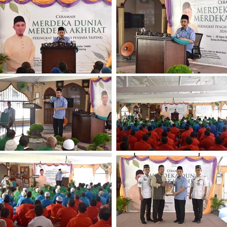 Ceramah Kemerdekaan 2024 "Merdeka Dunia, Merdeka Akhirat" Peringkat Penghuni Penjara Taiping telah diadakan pada hari Rabu, 28 Ogos 2024 bersamaan 23 Safar 1446H. Antara pengisian program ialah ceramah berkaitan kemerdekaan hakiki yang disampaikan oleh YBhg. Al-Fadhil Ustaz Haji Amir Adili bin Haji Mohd Noor, Pegawai Kader JAKIM, Bahagian Agama dan Kaunseling, IPPM. Penyampaian Cenderahati disempurnakan oleh Ustaz Muhamad Firdaus bin Abdullah, Ketua Unit Agama mewakili Pengarah Penjara Taiping. Program bermula jam 10.00 pagi dan berakhir jam 1.00 tengahari. Seramai 200 orang penghuni terlibat dalam program ini.
