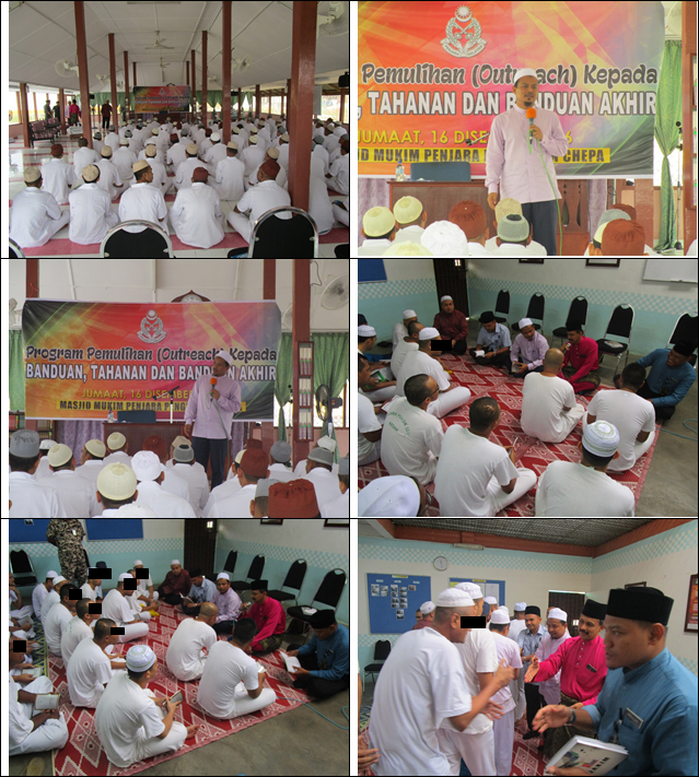 16 Disember 2016 (Jumaat) - Satu Program Pemulihan (Outreach) kepada Banduan dan Banduan Akhir telah diadakan di Penjara Pengkalan Chepa. Seramai 100 o/banduan terlibat dengan program di Masjid Mukim Penjara Pengkalan Chepa dan 18 o/Banduan Akhir terlibat dengan program di Bilik Akhir. Program outreach ini telah dihadiri oleh PKK Mat Rashid bin Jahlil bersama 3 orang kakitangan Seksyen Pemulihan dan Pendidikan, IPPM. Program ini turut disertai oleh PKK Kamarul Alam bin Taib, Pengarah Penjara Pengkalan Chepa Kelantan, pegawai kanan dan anggota Unit Pemulihan Penjara Pengkalan Chepa Kelantan. Antara pengisian program adalah aktiviti bacaan Yassin, ceramah yang telah disampaikan oleh Ustaz Zamihan bin Mat Zin dan di akhiri dengan Solat Jumaat bersama banduan di Masjid Mukim Penjara Pengkalan Chepa Kelantan.