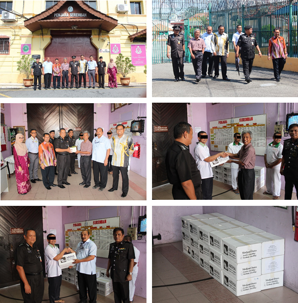 02 Jun 2016 (Khamis) - Lembaga Hakim Pelawat, Negeri Sembilan telah berbesar hati memberi sumbangan kurma untuk penghuni di Penjara Seremban. Sumbangan tersebut telah disampaikan oleh YBhg. Dato' Hj. Ibrahim bin Hassan, Timbalan Setiausaha Kerajaan, Negeri Sembilan kepada PKP Muhammad Nazri bin Nasrudin, Pengarah Penjara Seremban dan wakil penghuni di perkarangan Pintu Besar, Penjara Seremban.