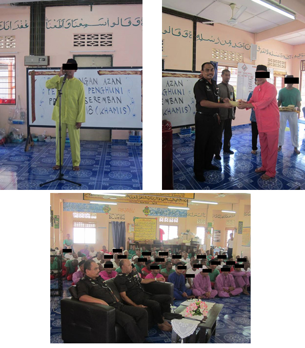 Pada 8 Februari 2018 (Khamis) bertempat di Surau Al-Ikhlas Penjara Seremban, telah diadakan Pertandingan Azan peringkat penghuni bermula pada jam 10.00 pagi. Seramai 20 orang penghuni telah mengambil bahagian di dalam pertandingan ini. Para peserta diuji dari sudut kelancaran, tarannum, lafaz azan yang betul, penampilan yang bersesuaian dan persembahan yang tersusun. Panel juri terdiri daripada Pegawai Agama Islam Penjara Seremban iaitu Ustaz Mohammad Nor bin Amran, Ustaz Muhammad Hazwan bin A Bakar dan Ustaz Mohd Fairuz bin Ismail. 3 orang penghuni yang memperoleh markah terbaik telah dipilih sebagai pemenang. Majlis penyampaian hadiah telah disempurnakan oleh PP Usman bin Mala, Timbalan Pengarah Penjara Seremban.