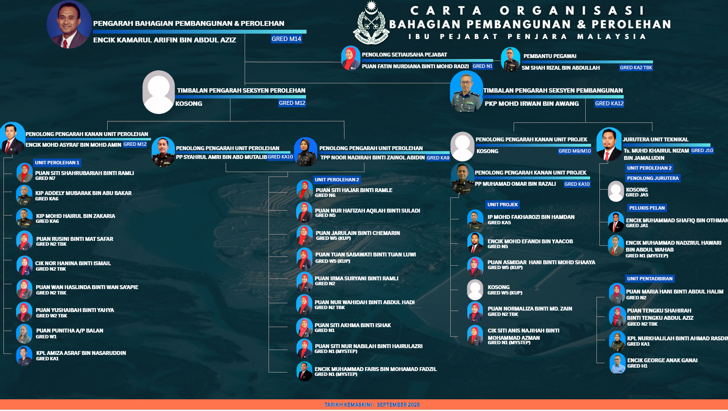 Bahagian Pembangunan dan Perolehan menggalas peranan dan tanggungjawab untuk memastikan semua perancangan projek pembangunan Jabatan Penjara Malaysia dilaksanakan dan siap mengikut tempoh dijadualkan.