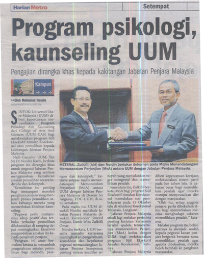 Pada 25 Oktober 2009 bertempat di Dewan Sri Angsana, Hotel EDC- UUM telah berlangsung majlis menandatangani memorandum perjanjian (MoA) diantara Universiti Utara Malaysia yang diwakili oleh Naib Canselor Y.Bhg.Tan Sri Nordin Kardi dengan Jabatan Penjara Malaysia yang wakili oleh Y.Bhg. Datuk Wira Hj. Zulkifli bin Omar, Ketua Pengarah Penjara Malaysia. Dengan termeterainya perjanjian ini, Universiti Utara Malaysia (UUM) diberi kepercayaan menyediakan Program Psikologi dan Kaunseling dari College of Arts and Sciences (UUM CAS) bagi melaksanakan program Sijil Amalan Koreksional yang akan membantu jabatan penjara menerokai bidang ilmu yang berkaitan dengan bidang pemulihan.