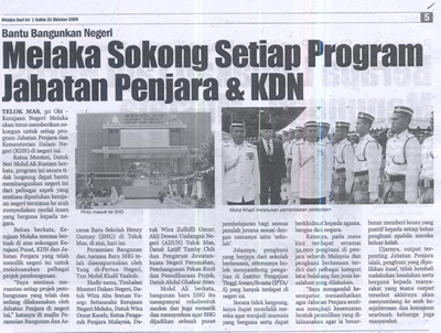 "Penghuni yang berjaya dari sekolah berkenaan, boleh melanjutkan pengajian mereka di IPT yang terdapat di negeri ini", katanya.Dalam ucapannya beliau turut mengemukakan pandangan supaya Jabatan Penjara sentiasa mengkaji kesesuaian bentuk pemulihan, bagi memastikan keberkesanan terhadap bekas penghuni yang dibebaskan. Hadir menyaksikan majlis itu ialah Timbalan Menteri Dalam Negeri, Datuk wira Abu Seman Yusop; Setiausaha Kerajaan Negeri Melaka, Datuk Wira Omar Kaseh; Ketua Pengarah Penjara Malaysia, Datuk Wira Zulkifli Omar; Ahli Dewan Undangan Negeri Teluk Mas, Datuk Latiff Tamby Chik dan Pengerusi Jawatankuasa Negeri Perumahan, Pembangunan Pekan Kecil dan Pemuliharaan Projek, Datuk Abdul Ghafar Atan. |