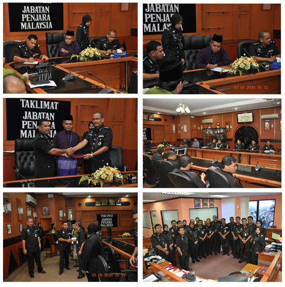 Pada 3 September 2010 telah berlangsung Majlis Penyerahan dan Penerimaan Tugas Pengarah Kepenjaraan , IPPM di antara TKPj Hj Abd Wahab bin Hj Kassim kepada PKP Ariffin bin Mohd. Noor dengan disaksikan oleh Y.Bhg KPj Dato' Haji Hassan bin Sakimon Timbalan Ketua Pengarah (Pengurusan). Majlis berlangsung di Bilik Mesyuarat Persidangan IPPM. Majlis telah dimulakan dengan menandatangani Dokumen Serah Terima Tugas dan diakhiri dengan bacaan doa oleh Ust. Abdul Hakim din Haron dari Unit Agama, IPPM. Turut hadir dalam majlis tersebut pengarah-pengarah bahagian dan semua anggota yang bertugas di Bahagian Kepenjaraan, IPPM. ![]() |