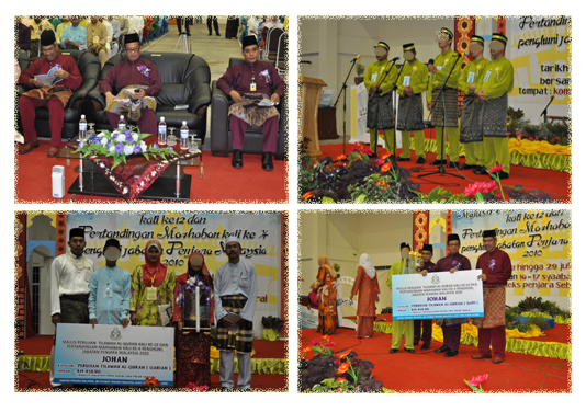 Majlis Perujian Tilawah Al-Quran kali ke12 dan Pertandingan Marhaban kali ke-4 telah berlangsung dengan jayanya di Kompleks Penjara Seberang Perai bermula pad 27 sehingga 29 Julai 2010. Seramai 21 Institusi Penjara di seluruh Malaysia telah mengambil bahagian dalam program tersebut. Seramai 20 banduan peserta Qari ,14 orang banduan peserta Qariah dan 5 kumpulan mengambil bahagian pertandingan marhaban. Majlis pembukaan dirasmikan Oleh PKK. AB Basir bin Mohamad, Pengarah Penjara Seberang Perai manakala majlis penyampaian hadiah dan perasmian penutupan telah disempurnakan oleh YS Komisoner Wan Mohamad Nazarie bin Wan Mahmood, Timbalan Ketua Pengarah Penjara Malaysia. Keputusan pertandingan mengikut kategori:- Kategori Lelaki acara Tilawah Al Quran 1.Tempat Pertama-Penjara Tapah (Mohd Yusof bin Mohd Aini) 2.Tempat Kedua-PPA Batu Gajah (Muhamad Rizal bin Ariffin) 3.Tempat Ketiga-Penjara Kajang (Ismail bin Marzuki) Kategori Wanita acara Tilawah Al Quran 1.Tempat Pertama-SHG, Telok Mas (Susiana binti Sunandi) 2.Tempat Kedua-PPA, Batu Gajah (Hariyati binti Haris) 3.Tempat Ketiga-Penjara Seberang Perai (Norazian binti Abdul Majid ) Kategori acara Marhaban 1.Tempat Pertama-Pokok Sena 2.Tempat Kedua-Penjara Seberang Perai 3.Tempat Ketiga-Penjara Kajang ![]() |