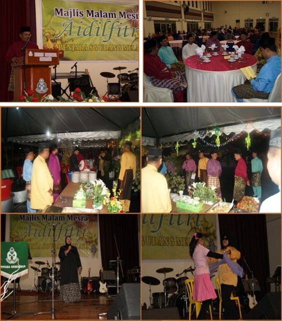 Melaka 14 September 2011 - Penjara Sungai Udang Melaka telah mengadakan Majlis Malam Mesra Aidilfitri yang dihadiri bersama ketua-ketua Institusi Jabatan Penjara Negeri Melaka. Majlis dimulakan dengan ucapan aluan oleh TKPj Nor Afifi Bin Sulong, Pengarah Penjara Sungai Udang Melaka. Aturcara majlis dimeriahkan dengan pertandingan gerai terbaik, pertandingan sketsa dan nyanyian oleh kakitangan dan pemberian duit raya kepada anak-anak kakitangan yang hadir.