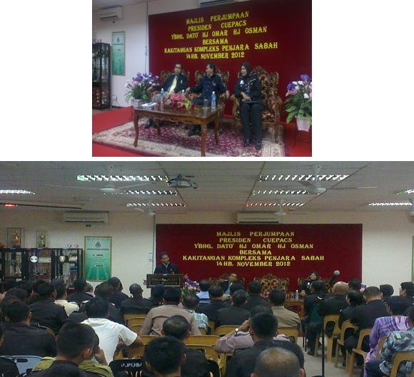 14 November 2012 - Presiden CUEPACS YBhg. Dato' Hj. Omar bin Osman bersama beberapa ahli exco telah hadir ke Kompleks Penjara Kota Kinabalu untuk perjumpaan bersama kakitangan penjara dan penjawat awam. Majlis ini juga turut dihadiri TKPj Hj Ahmad Faudzi bin Hj Awang, Pengerusi Persatuan Pegawai Penjara (POA), PKP Nora Binti Musa, Pengarah Wanita Kota Kinabalu, dan PP Maidin Bin Hj. Din, Pengarah Parol Negeri Sabah.