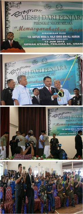 Pada 13 Jun 2012 (Rabu), Ahli Parlimen Tangga Batu, YB Datuk Wira Ir. Idrid bin Haron telah sudi merasmikan Program Mesej- Dari Penjara Peringkat Negeri Melaka anjuran bersama Jabatan Penjara Malaysia dan Yayasan Pencegahan Jenayah Malaysia (MCPF) Negeri Melaka. Ketibaan YB Datuk Wira disambut oleh YBhg. TKJP Dato' Hj Hassan bin Sakimon, Timbalan Ketua Pengarah Penjara (Keselamatan dan Koreksional), TKPj Haji Darussalam bin Haji Budin, Ketua Seksyen Pemulihan dan Rawatan dan TKPj Nor Afifi bin Sulong, Pengarah Penjara Sungai Udang.