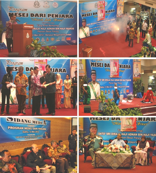 Pada 12 Mei 2012 (Sabtu), Menteri Besar Pahang YAB Dato' Sri Diraja Haji Adnan bin Haji Yaakob telah sudi merasmikan Program Masej Dari Penjara peringkat negeri Pahang pada jam 11.00 pagi. Ketibaan YAB Menteri Besar disambut oleh Timbalan Ketua Pengarah Jabatan Penjara Malaysia, YBhg. TKJP Dato' Hj Hassan bin Sakimon; Timbalan Pengerusi Yayasan Pencegahan Jenayah Malysia, YBhg. Tan Sri Lee Lam Thye; Pengarah Penjara Bentong, TKPj Abdul Aziz bin Abdul Razak dan pegawai-pegawai kanan kerajaan serta dif-dif kehormat.