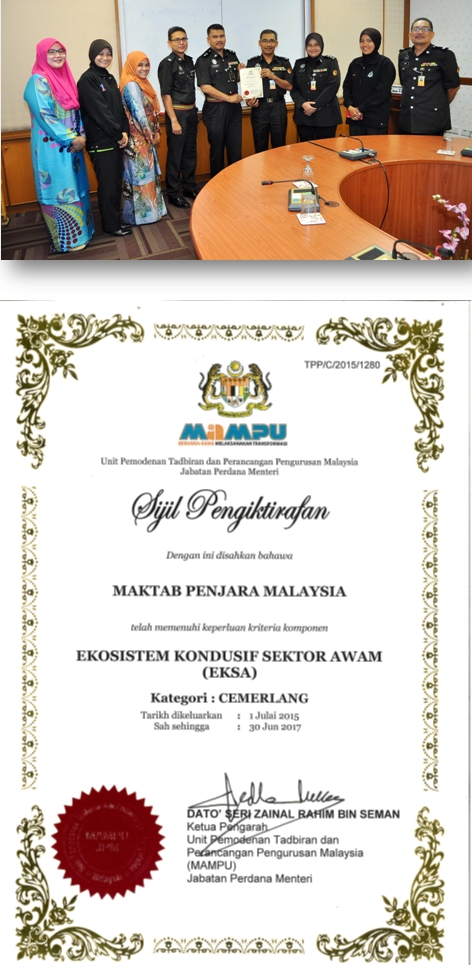 Maktab Penjara Malaysia telah menyahut cabaran yang telah ditetapkan oleh Bahagian Dasar Kepenjaraan, Ibu Pejabat Penjara Malaysia bertarikh 13 Januari 2015 untuk penjenamaan semula daripada Amalan Persekitaran 5S kepada Ekosistem Kondusif Sektor Awam (EKSA). Atas semangat kerja berkumpulan, Maktab Penjara Malaysia telah merancang dan menyusun atur tenaga kerja dengan menetapkan sasaran Persijilan EKSA dapat ditauliahkan sebelum bulan Julai 2015. Berkat kesungguhan dan komitment daripda semua warga kerja maka pada 7 Julai 2015, Maktab Penjara Malaysia telah menerima Sijil Cemerlang EKSA yang dikeluarkan oleh MAMPU.