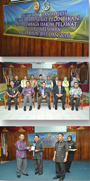 9 April 2015 - Majlis penyerahan surat perlantikan seramai 12 anggota Lembaga Hakim Pelawat Penjara bagi Negeri Terengganu 2015 dan 2016 telah disempurnakan oleh YBhg. TKPj Dato' Sakeri bin Hj Dollah, Timbalan Pengarah Pengurusan Banduan (Seksyen Vokasional Dan Industri) Ibu Pejabat Penjara Malaysia bertempat di Dewan Dato' Ibrahim Penjara Marang Terengganu.