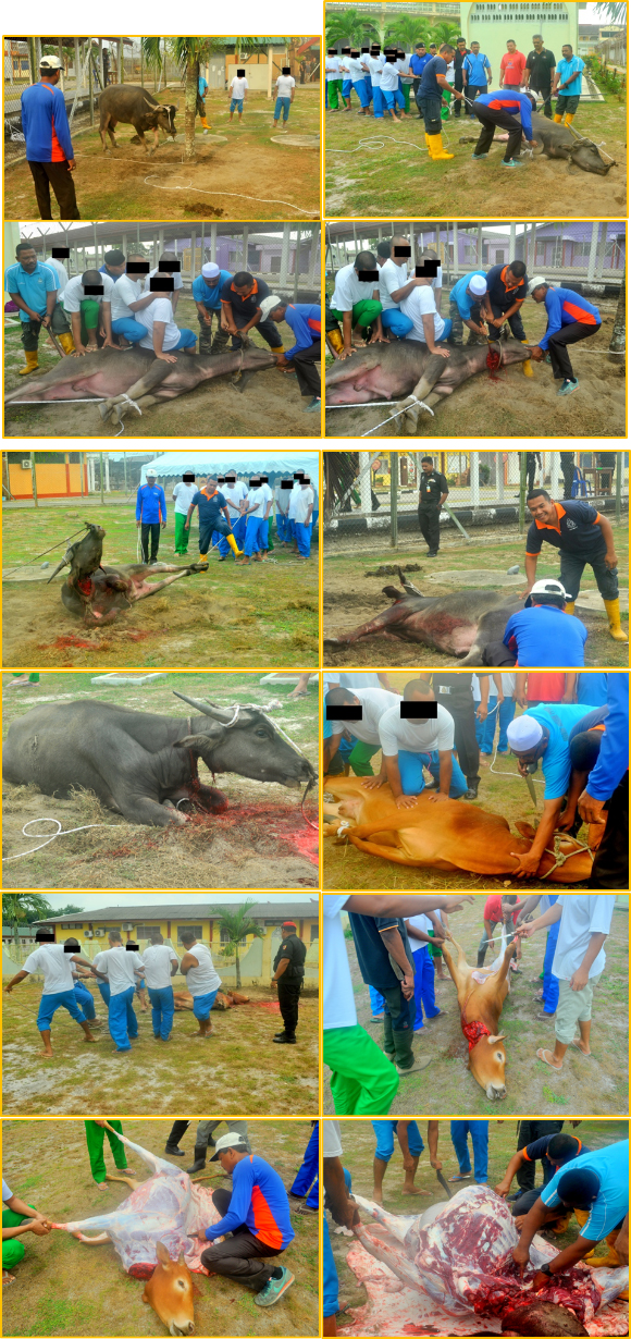 Aidiladha ini adalah merupakan perayaan yang istimewa kerana ia merupakan hari untuk seluruh umat Islam memperingati kisah pengorbanan Nabi Ibrahim a.s. dan anaknya Nabi Ismail a.s. dalam memenuhi perintah Allah SWT. Justeru itu, biarpun terpisah dengan dunia luar dan terpenjara disebalik tembok berjeriji besi ini, para penghuni yang beragama Islam tetap diberi peluang untuk meraikan bersama dan ia sebenarnya salah satu usaha pemulihan yang diterapkan oleh pihak penjara kepada para penghuni, agar dapat memupuk kesedaran dan keinsafan dalam diri akan nilai pengorbanan dalam hidup apabila mereka dibebaskan kelak. PKK Wan Sani Bin Ab. Latiff Pengarah Penjara Marang, Terengganu amat berbesar hati apabila program ini turut mendapat kerjasama yang baik dari pihak Majlis Agama Islam Dan Adat Melayu Terengganu (MAIDAM) dan Individu dengan menyumbangkan sebanyak 2 ekor lembu dan 1 ekor kerbau untuk dikorbankan. Program telah berjalan dengan lancar dan berakhir pada jam 12.30 tengah hari. ![]() |