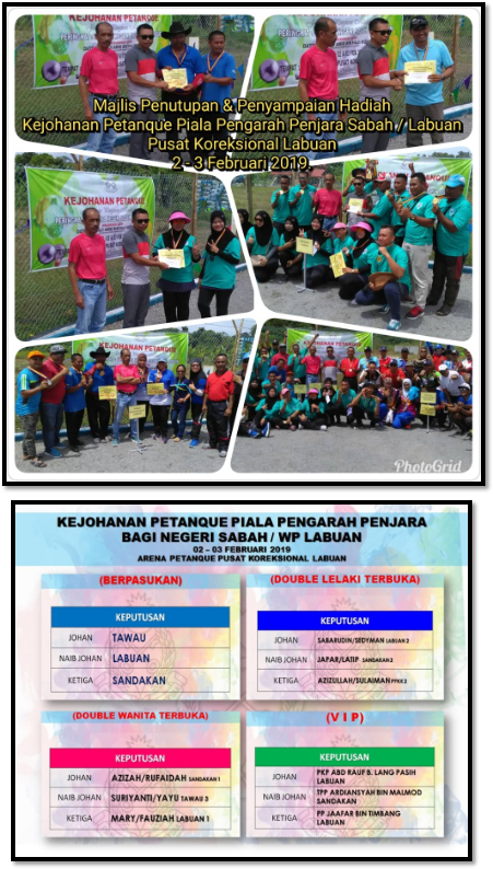 Pada 03 Februari 2019 telah berlangsung Majlis Penutupan & Penyampaian Hadiah sempena Kejohanan Petanque Piala Pengarah Penjara Negeri Sabah & Wilayah Persekutuan Labuan bertempat di Arena Petanque Pusat Koreksional Labuan. Majlis penyampaian hadiah telah disempurnakan oleh Penolong Komisioner Penjara, Abd Rauf bin Lang Pasih, Pengarah Pusat Koreksional Labuan dan disaksikan oleh Penguasa Penjara, Jaafar bin Timbang, Timbalan Pengarah Pusat Koreksional Labuan. 05 institusi telah mengambil bahagian iaitu Pusat Koreksional Labuan selaku pengelola kejohanan, Penjara Pusat Kota Kinabalu, Penjara Tawau, Penjara Sandakan dan Sekolah Henry Gurney Keningau. Bagi Acara Terbuka Lelaki Berpasangan : Pusat Koreksional Labuan - Johan, Penjara Sandakan - Naib Johan & Penjara Pusat Kota Kinabalu - Ketiga. Bagi Acara Terbuka Wanita Berpasangan : Penjara Sandakan - Johan, Penjara Tawau - Naib Johan & Pusat Koreksional Labuan - Ketiga. Bagi Acara VIP : Pusat Koreksional Labuan Johan & Ketiga manakala Penjara Sandakan Naib Johan. Keputusan keseluruhan, Penjara Tawau menjadi Johan dan membawa pulang Piala Pusingan Kejohanan manakala Pusat Koreksional Labuan menjadi Naib Johan dan Penjara Sandakan tempat Ketiga. Semua pemenang telah menerima medal dan hadiah wang tunai.