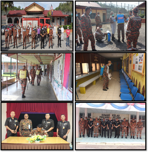 13 April 2020 (Isnin) ? Institusi Pemulihan Dadah Jelebu (IPDJ) telah bekerjasama dengan Jabatan Bomba & Penyelamat Negeri Sembilan dan Majlis Daerah Jelebu dalam menjayakan bantuan semburan pembasmi kuman (nyah cemar) di institusi ini. Turut hadir PKK Abd. Rahman bin Taib Pengarah Penjara Negeri Sembilan, PKP Fayrouz bin Ahmad Zawawi Pengarah IPDJ dan PgB Mohd Hafiz bin Mohd Sharif Ketua Zon III Jabatan Bomba dan Penyelamat Negeri Sembilan serta En. Ahmad Marhan bin Abu Bakar Pegawai Majlis Daerah Jelebu. Operasi ini melibatkan seramai (37) orang anggota Jabatan Bomba & Penyelamat Negeri Sembilan dan (5) orang kakitangan Majlis Daerah Jelebu. Semburan pembasmi kuman (nyah cemar) ini bagi membendung penularan Covid-19 dikalangan anggota dan penghuni. Sanitasi ini melibatkan kawasan dalam dan luar penjara serta kawasan perumahan kakitangan.