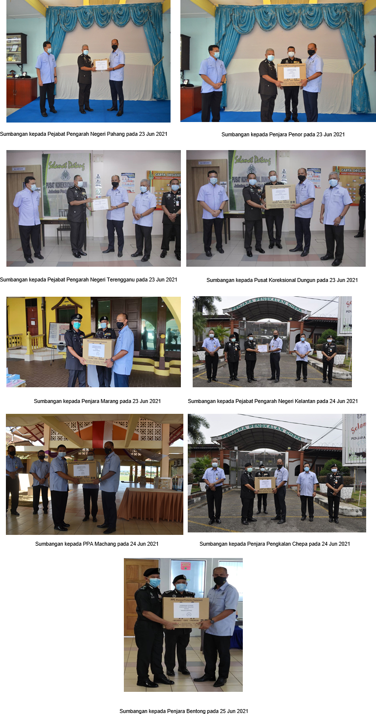 Sempena dengan lawatan YBhg. Dato' Komisioner Jeneral Penjara ke Institusi Penjara Zon Timur pada 23 Jun hingga 25 Jun 2021, Yayasan Koreksional Malaysia telah memberikan sumbangan Fullset Medical Face Shield pada anggota Penjara Zon Timur. Sumbangan telah disampaikan oleh YBhg Dato' Haji Nordin Bin Haji Muhamad, Komisioner Jeneral Penjara Malaysia merangkap Pengerusi Yayasan Koreksional Malaysia. Sumbangan adalah sebagai perlindungan tambahan bagi institusi penjara di Zon Timur iaitu  Pejabat Pengarah Penjara Negeri Pahang, Pejabat Pengarah Penjara Negeri Terengganu, Pejabat Pengarah Penjara Negeri Kelantan, Penjara Bentong, Penjara Penor, Penjara Marang, Pusat Koreksional Dungun, Penjara Pengkalan Chepa dan Pusat Pemulihan Akhlak Machang.