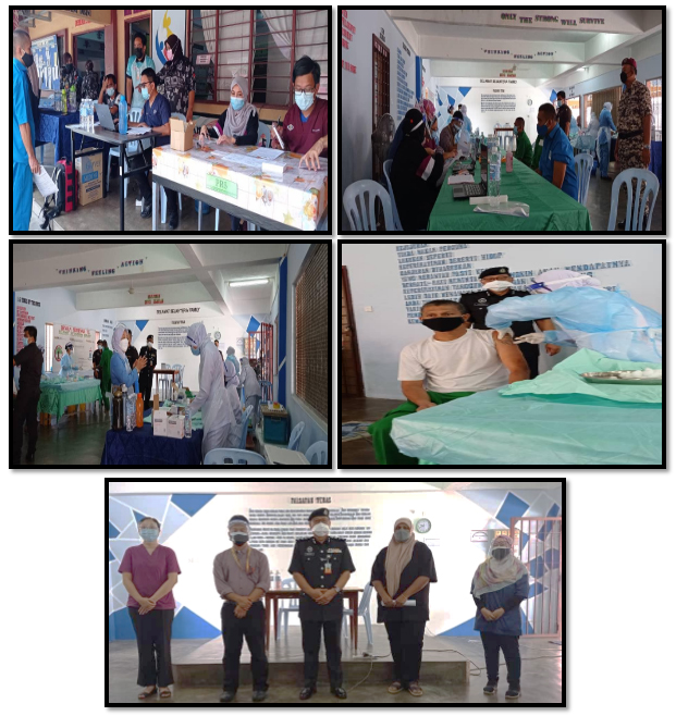 08 September 2021 (Rabu) - Institusi Pemulihan Dadah Jelebu (IPDJ) telah bekerjasama dengan Pejabat Kesihatan Daerah Jelebu (PKDJ) dalam menjayakan Program Vaksinasi Penghuni di institusi ini.  Turut hadir PKP Shahrom bin Mohamed Pengarah IPDJ. Program ini diketuai oleh Dr. Farhana Sarah Diyana Binti Taha bersama (13) kakitangan PKDJ dan (15) kakitangan IPDJ. Seramai (300) orang penghuni telah berjaya di vaksin di dalam program ini dengan mematuhi SOP pencegahan pandemik Covid-19 yang telah ditetapkan.