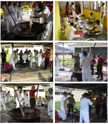 Aturcara program bermula jam 9.00 pagi itu melibatkan seramai 51 orang tahanan (POPOC) dan sebahagian pegawai-pegawai dan anggota-anggota Unit Runding Cara Tahanan. Pelbagai persediaan diatur sebelum program bermula antaranya penyediaan bahan-bahan membuat dodol, kawah dan bahan-bahan yang digunakan. Kerjasama serta penglibatan daripada daripada semua pihak, akhirnya 4 kawah dodol telah siap dimasak dengan mengambil masa lebih kurang 6 jam dan kemudian aktiviti membungkus dodol turut dibuat dalam suasana yang meriah untuk diedarkan kepada lebih 1206 penghuni PPA Simpang Renggam. Kepuasan dan kemeriahan jelas terpancar di wajah pihak yang terlibat apabila program yang dianjurkan ini berjalan dengan lancar tanpa sebarang masalah dan ianya merupakan pengalaman pertama yang amat manis bagi tahanan-tahanan sepanjang tempoh ditempatkan di PPA Simpang Renggam.