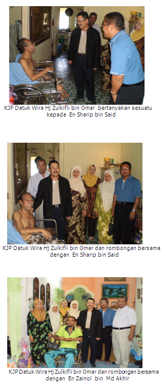 Seterusnya lebih kurang jam 6.15 ptg, Y.Bhg Datuk Wira dan ahli rombongan telah membuat lawatan ke rumah En. Zainol bin Md Akhir,di Taman Sri Bagan, Tandop Alor Setar, Kedah. Beliau mengalami hilang upaya kekal dari pinggang ke bawah akibat kemalangan jalanraya pada tahun 2004.
