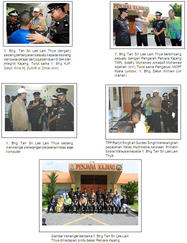 Sebelum meneruskan rangka lawatan yang telah diaturkan, Y.Bhg. Tan Sri telah membuat kunjungan hormat kepada Y.Bhg.Datuk Wira Hj. Zulkifli Omar di Pejabat Komisioner Penjara , Bukit Wira dan telah diberikan taklimat Jabatan daripada Pengarah Bahagian Pemulihan dan Pengarah Parol. Sidang akhbar bersama media turut diadakan di akhir sesi lawatan kunjungan hormat ini.