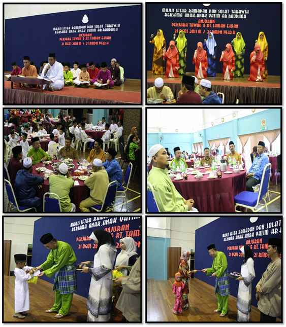 Penjara Tawau , 21 Ogos 2011 � Bertempat di Dewan Wawasan, Taman Ehsan Penjara Tawau telah diadakan Majlis Berbuka Puasa Kakitangan Bersama Anak-Anak Yatim Ar- Raudhah. Majlis telah dihadiri oleh PKP Sazali Bin Ismail bersama isteri dan kakitangan bersama keluarga. Majlis turut diserikan dengan kehadiran Ketua-Ketua Jabatan sekitar Daerah Tawau dan Ketua Pejabat Kedutaan Indonesia. Aturcara dimulai dengan Majlis Khatam Al-Quran anak-anak kakitangan Penjara Tawau dan persembahan pentomen daripada kumpulan Al-Khausar. Majlis diteruskan dengan berbuka puasa, menunaikan solat maghrib berjemaah, ceramah semarak ramadhan, solat isyak berjemaah, solat terawih dan majlis jamuan makan malam.