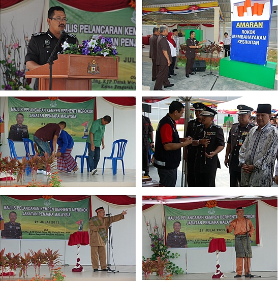 Pada 21 Julai 2011 Khamis, Bahagian Pengurusan Banduan, Ibu Pejabat Penjara Malaysia dengan kerjasama Penjara Sungai Udang, Melaka telah melancarkan Kempen Berhenti Merokok Jabatan Penjara Malaysia. Majlis ini telah dirasmikan oleh Y. Bhg. KJP Datuk Wira Hj. Zulkifli bin Omar, Ketua Pengarah Penjara Malaysia. Seramai lebih kurang 200 orang tetamu telah hadir antaranya Yang Berhormat Datuk Hj. Adderis bin Hj. Kassim dan Yang Berhormat Datuk Latipah bt Omar (wakil Kerajaan Negeri Melaka), Yang Bahagia KPj Dato' Hj. Hassan bin Hj. Sakimon, Pengarah-Pengarah Bahagian, Pengarah-Pengarah Institusi zon tengah dan zon selatan serta kakitangan Jabatan Penjara Malaysia. Majlis ini turut menjemput En. Martin Balhetchet dari Malaysian Care untuk berkongsi pengalaman mengenai masalah penagihan dadah dan tabiat merokok serta cara mengatasi masalah ketagihan tersebut. Di samping itu, Kementerian Kesihatan Melaka juga mengadakan pameran mengenai Program Berhenti Merokok dan pameran Penjara Seremban turut diadakan. Majlis bersurai dengan makan tengahari di Dewan Serbaguna Penjara Sungai Udang.
