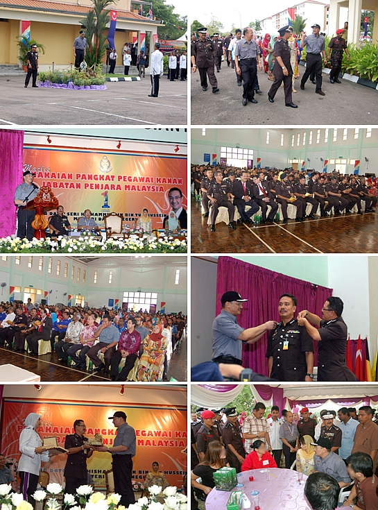 Khamis 16 Jun 2011 Penjara Kluang, Johor telah menjadi tuan rumah untuk majlis pemakaian pangkat pegawai kanan Jabatan Penjara Malaysia. Majlis bermula tepat jam 1500hrs dengan ketibaan YB. Dato' Seri Hishammuddin Bin Tun Hussein, Menteri Dalam Negeri dengan diiringi oleh Y. Bhg. Datuk Wira Haji Zulkifli Bin Omar, Ketua Pengarah Penjara yang sudi menerima tabik hormat serta memeriksa kawalan kehormat dari pegawai dan anggota yang terlibat. Majlis telah diadakan di Dewan Sri Siantan Kompleks Penjara Kluang, Johor dan pada majlis berkenaan, YB Menteri Dalam Negeri sudi untuk menyematkan pangkat kepada 45 orang pegawai kanan yang telah dinaikkan pangkat serta menyampaikan Pingat Bakti Setia kepada Timbalan Ketua Setiausaha Kanan Kementerian Dalam Negeri iaitu YM Dato Raja Azahar Bin Raja Abdul Manap. Selepas majlis pemakaian pangkat berkenaan selesai YB Menteri Dalam Negeri dibawa oleh Y. Bhg. Datuk Wira Ketua Pengarah Penjara untuk melawat tapak Perjumpaan Bersemuka 1Malaysia dimana, seramai 50 orang banduan yang dipilih telah berpeluang untuk berjumpa dengan keluarga secara bersemuka. Pada lawatan berkenaan, YB Menteri Dalam Negeri mengambil kesempatan untuk beramah mesra dengan keluarga banduan serta menyampaikan cenderahati kepada banduan yang terlibat. Majlis diakhiri tepat jam 1700hrs dengan semua yang terlibat dijemput untuk menikmati hidangan minum petang yang telah disediakan.