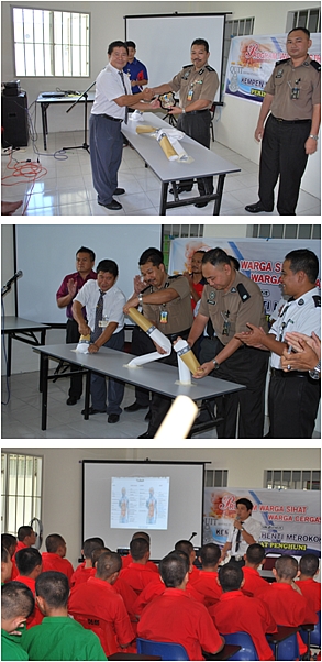 PENJARA LIMBANG, 12 Oktober 2011 - Unit Pemulihan dan Rawatan, Penjara Limbang telah mengadakan Program Warga Sihat Warga Cergas sempena Kempen Berhenti Merokok dengan kerjasama Jabatan Kesihatan Hospital Limbang. Program dimulakan dengan Senamrobik yang telah diketuai oleh En Zainuddin Bin Ali dari Kementerian Pembangunan Sosial dan Urbanisasi Cawangan Limbang. Seramai 181 orang penghuni dan 20 orang kakitangan Penjara Limbang telah menyertai senamrobik itu. Di antara pengisian lain ialah Ceramah Kempen Berhenti Merokok dari Pegawai Kesihatan Hospital Limbang, lawatan ke tapak pameran dan pertandingan melukis yang diadakan dibilik Fasa 1, Blok PPI. Penolong Komisioner Penjara Charin Promwichit bersama Pegawai Kesihatan, Hospital Limbang telah menyempurnakan gimik perasmian kempen dengan mematahkan replika rokok diikuti dengan penyampaian cenderahati kepada wakil penceramah. Pada sebelah petangnya telah diadakan perlawanan bola tampar di antara pegawai PPI dengan para penghuni.