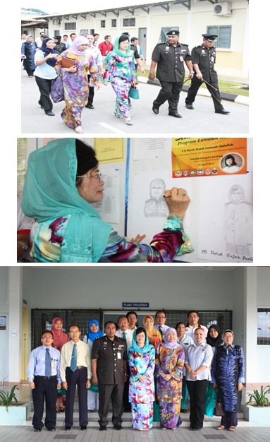 Kuching, 24 April 2012 - Menteri Kebajikan, Wanita dan Pembangunan Keluarga Negeri Sarawak Yang Berhormat Datuk Hajah Fatimah Abdullah telah melapangkan masa selama lebih kurang 3 jam di Penjara Puncak Borneo Kuching. Beliau bersama rombongan yang terdiri daripada Pengarah Jabatan Kebajikan Masyarakat, Puan Noriah Bt.Haji Ahmad, Timbalan Pengerusi Majlis Wanita dan Keluarga Sarawak, Datin Dr. Hajah Napsiah Mahfoz dan beberapa orang pegawai kanan kerajaan persekutuan serta negeri telah dibawa melawat Sekolah Integriti di mana mereka diberi penerangan tentang aktiviti dan program yang dilaksanakan di sekolah tersebut.