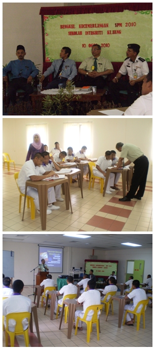 Bengkel Kecemerlangan SPM Sekolah Integriti Kluang tahun 2010 telah diadakan pada hari Selasa, 10 Ogos 2010 jam 10.00 pagi bertempat di Dewan Tun Hussien Onn, Sekolah Integriti Kluang, Johor. Bengkel ini telah dikendalikan oleh En Azizul Rahman Bin Abdul Rahman dari SMK Dato? Sulaiman, Batu Pahat Johor yang merupakan seorang guru cemerlang yang memberi bimbingan kepada pelajar bagi subjek Bahasa Melayu. Bengkel ini telah dihadiri oleh semua calon SPM 2010 dan Pra SPM Sekolah Integriti Kluang. Semoga inisiatif ini memberi manfaat kepada calon-calon yang akan menduduki peperiksaan SPM tahun 2010 mendapat keputusan yang cemerlang dalam keputusan peperiksaan SPM kelak. ![]() |
