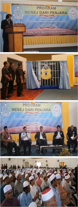 19 Jun 2012 (Selasa), Majlis perasmian Mesej Dari Penjara peringkat negeri Kelantan telah dirasmikan oleh Pengarah Jabatan Pembangunan Persekutuan Negeri(JPPN), YBhg. Dato' Makhtar bin  Mustapha Ahli.   Ketibaan YBhg. Dato' Makhtar disambut oleh PKK Muhammad Zuki bin Muhammad Zain, Pengarah Pusat Pemulihan Akhlak Machang dan YBhg. Dato' Abdul Aziz bin Nawi, Pengerusi Yayasan Pencegahan Jenayah Malaysia  Negeri Kelantan. Sebelum majlis perasmian, satu ceramah motivasi telah disampaikan  oleh PP Mat bin Yaacob, Pengarah Parol Negeri Kelantan kepada pelajar-pelajar dari beberapa buah sekolah menengah di sekitar Jajahan Machang. Di antara pengisian aktiviti pada majlis tersebut ialah persembahan sketsa oleh kakitangan PPA Machang,  ceramah jemputan oleh bekas tahanan PPA Machang yang telah berjaya dan Forum "Kembali Ke Pangkuan Masyarakat".  Program Mesej Dari Penjara Peringkat Negeri Kelantan telah berlangsung di Dewan Sebaguna, PPA Machang. Majlis anjuran bersama Jabatan Penjara Malaysia dan Yayasan Pencegahan Jenayah Malaysia  Negeri Kelantan ini telah dihadiri oleh pemimpin-pemimpin masyarakat, imam-imam, ketua-ketua jabatan, NGO's dan pelajar-pelajar UiTM Machang serta murid-murid sekolah menengah.