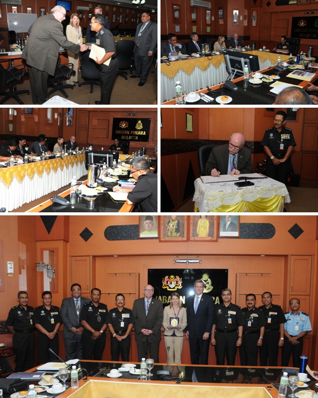 4 Mac 2013, Ibu Pejabat Penjara Malaysia menerima lawatan oleh Mr Gerard F. Ramker Deputy Director US Department of Justice dan Ms Lynn Laugton Austell, pegawai Bureau of Justice Statistics (BJS), US Department of Justice. Lawatan bertujuan berkongsi pengalaman dengan agensi-agensi berkaitan di Malaysia mengenai proses pengumpulan data berhubung isu-isu criminal justice. Sesi interaktif yang disertai pengurusan tertinggi jabatan mengambil peluang bertukar-tukar maklumat dan pengetahuan untuk membangunkan sistem pengumpulan data yang efektif dalam isu yang berkaitan National Correctional Reporting Program, Prison/ Jail Inmate Surveys dan Recidivism Research Program.