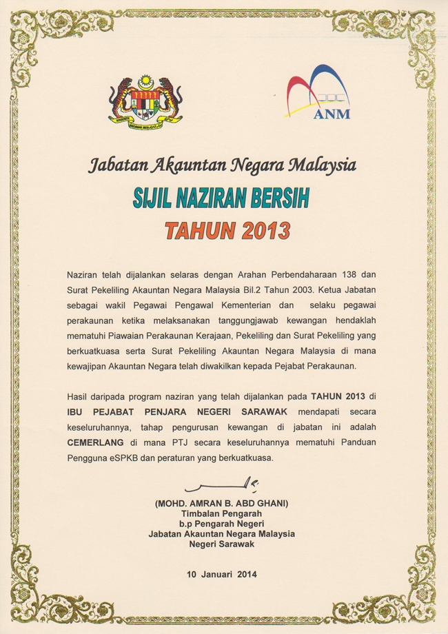 Sijil Naziran Bersih Tahun 2013 - Ibu Pejabat Penjara Negeri Sarawak