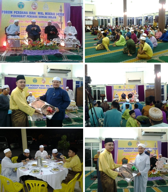 27 Mei 2014 Majlis Forum Perdana sempena sambutan Israk Wal Mikraj peringkat Penjara Sungai Buloh anjuran bersama Pejabat Agama Islam Daerah Gombak dan Surau An-Nur Penjara Sungai Buloh telah diadakan selepas solat maghrib dengan pengisian ceramah bertajuk "Satu Aqidah Sejahtera Ummah" yang disampaikan oleh Yang Berbahagia Ustaz Fauzi Bin Mustafa (moderator), Yang Berbahagia Ustaz Harryanto Rizal Bin Rokman, Yang Berbahagia Ustaz Ahmad Husni bin Dato' Abdul Rahman, dan Yang Berbahagia Ustaz Haji Ahmad Hafiz bin Muhamad Alwi. Majlis turut diserikan dengan kehadiran Yang berbahagia Tuan Kadi Daerah Gombak Tuan Hj Zainal dan PP Raja Nazril Azman Bin Raja Azam Iskandar, Pengerusi Surau An-Nur.