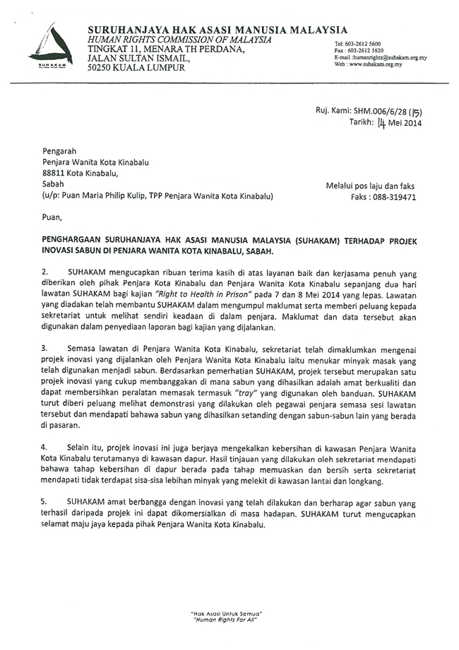Penghargaan SUHAKAM Terhadap Projek Inovasi Sabun Di Penjara Wanita Kota Kinabalu, Sabah