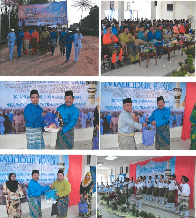 Pada 20 Januari 2015, Pusat Pemulihan Pemasyarakatan Kem Syed Sirajuddin Gemas telah menganjurkan Program Sambutan Maulidur Rasul 1436 Hijrah dengan tema Perpaduan Nadi Transformasi Negara. Majlis tersebut telah disempurnakan oleh TKPj Yasuhimi bin Yusoff, Timbalan Pengarah Parol dan Perkhidmatan Komuniti Jabatan Penjara Malaysia. Majlis juga diserikan lagi dengan kehadiran Lt Kol Mohd Faiz bin Ahmad, Ketua Cawangan Tadbir dan Logistik Kem Sirajuddin Gemas, Penguasa Penjara Asri bin Sabu Pengarah Parol dan Perkhidmatan Negeri Sembilan, TPP Wan Rosli bin Dolah PYM PPP KEm Syed Sirajuddin, bersama Mejar Jasmi bin Sidik, Ketua Pembantu Wadar serta pegawai dan anggota PPP dan pembantu wadar. Program tersebut disajikan lagi dengan persembahan nasyid kumpulan Al-Imtiyaz (ODS) dan ceramah oleh Ust Wan Aminuddin bin Wan Abdullah, Bahagian Unit Kaunseling Jabatan Agama Islam Negeri Sembilan.
