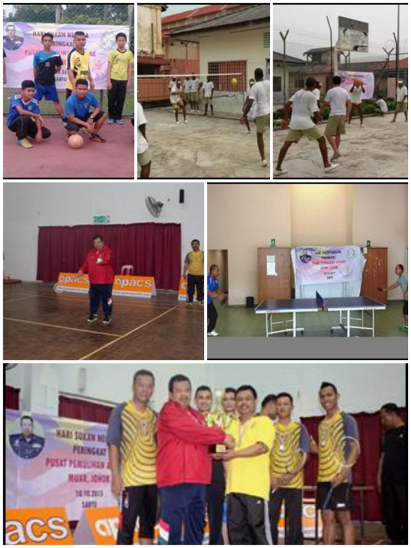 Pada 10 Oktober 2015 (Sabtu), bertempat di Dewan Taman Gemilang, Kuarters Kakitangan PPA Muar telah diadakaan Sukan Negara Peringkat Institusi. Aturcara bermula jam 0730 pagi dengan senamrobik dan aktiviti gotong-royong. Antara acara sukan yang diadakan pada hari tersebut ialah pertandingan Badminton Piala Pengarah PPA Muar, futsal, pingpong peringkat kakitangan dan juga sepak takraw di kalangan orang tahanan. .