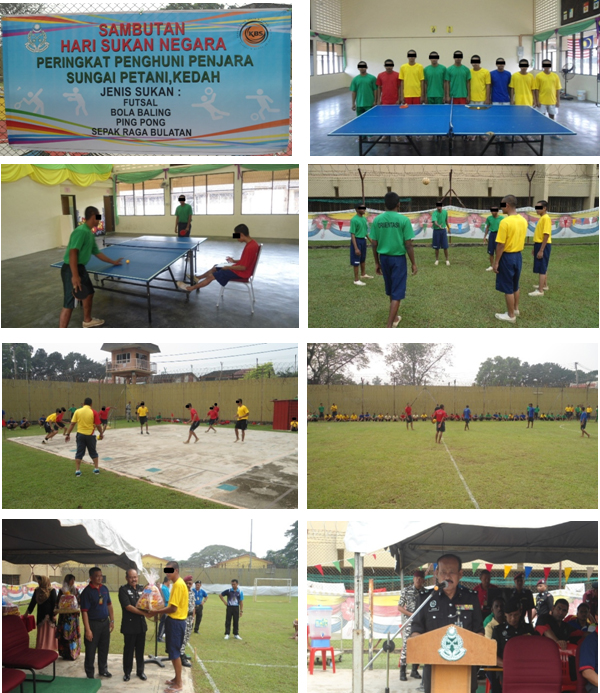 Pada 6 Oktober 2015 (Selasa), Penjara Sungai Petani telah mengadakan Sambutan Hari Sukan Negara Peringkat Penghuni Penjara Sungai Petani. Sambutan ini diadakan bagi menyahut seruan kerajaan dalam menjadikan negara sebagai sebuah ?Negara Bersukan?. Selain dapat menjamin kecergasan, kecerdasan minda dan kesihatan, sambutan Hari Sukan Negara peringkat penghuni ini juga dilihat dapat mendisiplinkan diri penghuni dan sebagai salah satu daripada aktiviti pemulihan. Sebanyak empat jenis sukan dipertandingkan iaitu Futsal, Bola Baling, Sepak Raga Bulat, Pingpong yang disertai oleh seramai 80 orang penghuni. Majlis penyampaian hadiah telah disempurnakan oleh Penguasa Jamaludin bin Awang Kechik, Timbalan Pengarah Penjara Sungai Petani.
