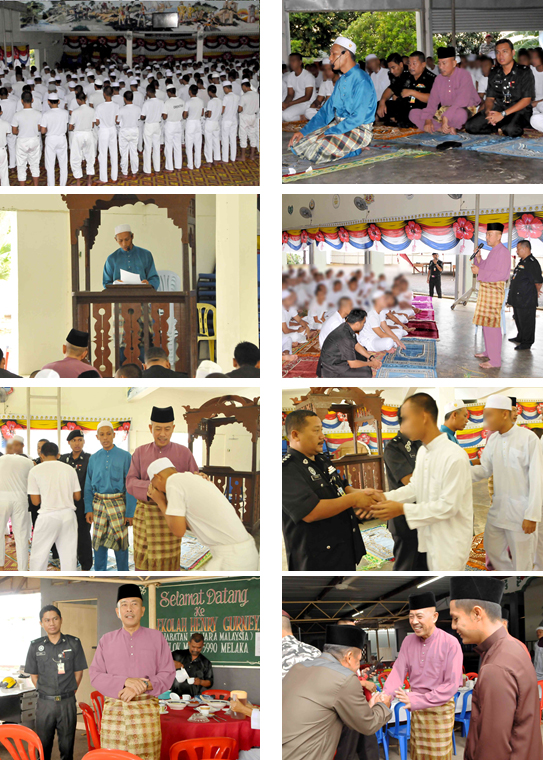 6 Julai 2016 (Rabu) - Sempena 1 Syawal 1437H, pihak pengurusan Sekolah Henry Gurney Telok Mas, Melaka telah mengambil inisiatif mengadakan Solat Sunat Aidilfitri bersama dengan lebih kurang 150 penghuni Islam bertempat di Dewan Parameswara. Solat sunat ini bertujuan memberi peluang kepada penghuni mendirikan solat secara berjemaah dalam menzahirkan nikmat setelah sebulan menjalani ibadah puasa di samping dapat berhimpun dan bermaafan dipagi hari raya. Solat sunat Aidilfitri ini telah dimulakan pada jam 9.00 pagi yang diimamkan oleh Ustaz Zainuddin Bin Talib dan turut dihadiri oleh PKP Abd Rahman Bin Taib, Pengarah SHG Telok Mas Melaka dan Pegawai Yang Bertugas, KIP Azman bin Mat Yashim bersama pegawai kanan serta anggota penjara yang bertugas pada hari tersebut.