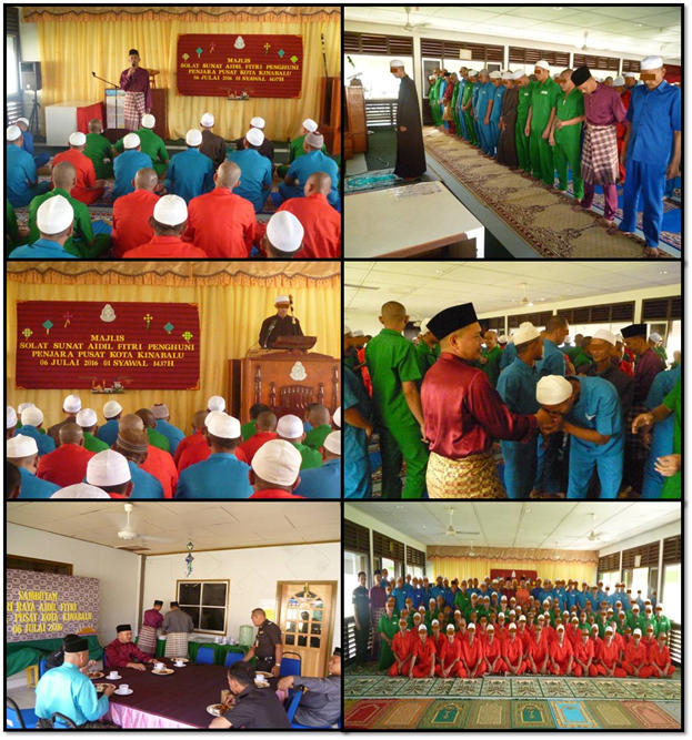 06hb Julai 2016 (Rabu) - Sempena 1 Syawal 1437H, Unit Pemulihan Penjara Pusat Kota Kinabalu telah mengadakan Solat Sunat Aidilfitri bersama dengan penghuni beragama Islam bertempat di Surau Penghuni Penjara Pusat Kota Kinabalu. Solat sunat ini telah dimulakan pada jam 8.00 pagi yang turut dihadiri oleh PP Kalbin Hj Mohd Said, Timbalan Pengarah Penjara Pusat Kota Kinabalu bersama pegawai pemulihan serta anggota penjara yang bertugas pada hari tersebut. Solat Sunat Aidilfitri ini melibatkan seramai 120 penghuni.