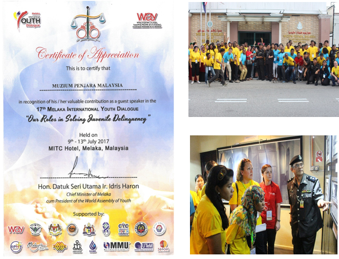 3 Ogos 2017 (Selasa) - Muzium Penjara Malaysia telah menerima sijil penghargaan daripada YAB Datuk Seri Utama Ir. Hj. Idris bin Hj. Haron, Ketua Menteri Melaka merangkap Presiden World Assembly of Youth sempena lawatan World Assembly of Youth seramai (140) orang ke Muzium Penjara Malaysia Melaka.