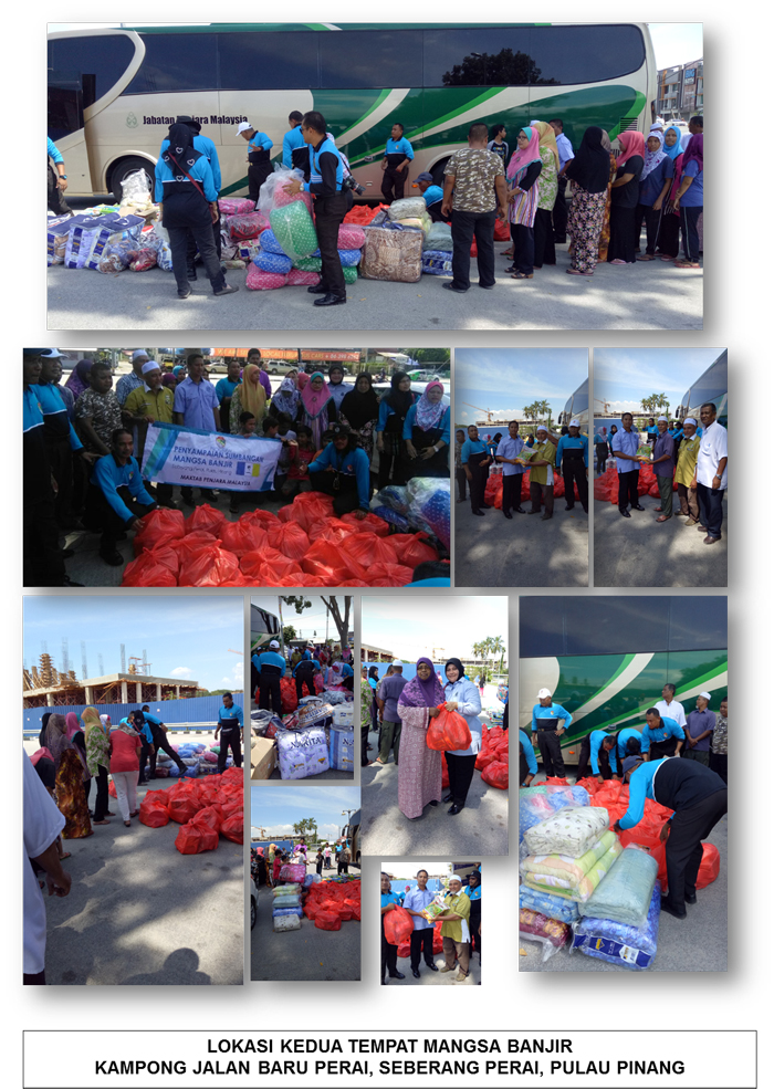 17 November 2017 - Atas dasar keprihatinan dan simpati, Pengarah dan semua warga MPM telah mengadakan satu ?Program Penyampaian Sumbangan Kepada Mangsa Banjir Di Seberang Perai, Pulau Pinang? bagi membantu mangsa-mangsa banjir yang kini amat memerlukan bantuan. Seramai 13 orang wakil kakitangan Maktab Penjara Malaysia dari pelbagai pangkat telah menjayakan program tersebut. Banyak sumbangan berupa barang makanan dan keperluan harian telah disumbangkan oleh agensi-agensi kerajaan, agensi-agensi bukan kerajaan dan orang perseorangan antaranya daripada Kelab Sukan dan Kebajikan Maktab Penjara Malaysia (KASBA), Bahagian Parol dan Perkhidmatan Komuniti, Ibu Pejabat Penjara Malaysia, Institut Jantung Negara (IJN), Eternity Ventures Sdn Bhd, Ogre Pest Controls Sdn Bhd, Mutiara Fiq Resource, Ame Jasa Enterprise, Hanara Solution, Dynamic Project Solution, Waris Tunggak Services Sdn Bhd dan Kakitangan Maktab Penjara Malaysia. Program bermula dengan Pengumpulan Bantuan Banjir pada 16 November 2017 di MPM dan Penghantaran Bantuan Banjir pada 17 November 2017 ke dua buah kampung di Seberang Perai, Pulau Pinang iaitu Kampung Permatang Rawa dan Kampung Jalan Baru Perai.