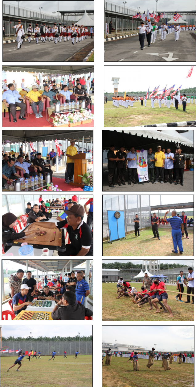 "" Acara bermula pada pukul 8:00 pagi di mana kesemua kontinjen rumah pasukan masuk ke padang serta diiringi oleh kumpulan Pancaragam Sekolah Henry Gurney, Telok Mas. Program dirasmikan oleh YB Datuk Roslan bin Datuk Hj Ahmad, ADUN Kawasan Merlimau, Melaka. Turut hadir ialah Pengarah Pusat Koreksional Jasin PKP Arzaee bin Abdullah, Penguasa Penjara Mohd Rothman bin Bujang, Penguasa Penjara Mohd Hairul Hisyam, Penguasa Penjara Mohd Saifullah bin Md Akhir, Penguasa Penjara Mohamad Saizi bin Ibrahim dan Timbalan Penguasa Penjara Aswari bin Che Ibrahim. Antara acara yang dipertandingkan termasuklah sukaneka antara keluarga penghuni, perlawanan bola sepak antara penghuni dan kakitangan, lari 100 meter, dart, sepak takraw, karom, congkak, dam dan acara kemuncak tarik tali. Suasana meriah dengan tepukan dan sorakan para penonton. Majlis diserikan dengan pertunjukan pancaragam dari Sekolah Henry Gurney Telok Mas dan upacara penyampaian hadiah yang menjadi acara kemuncak.