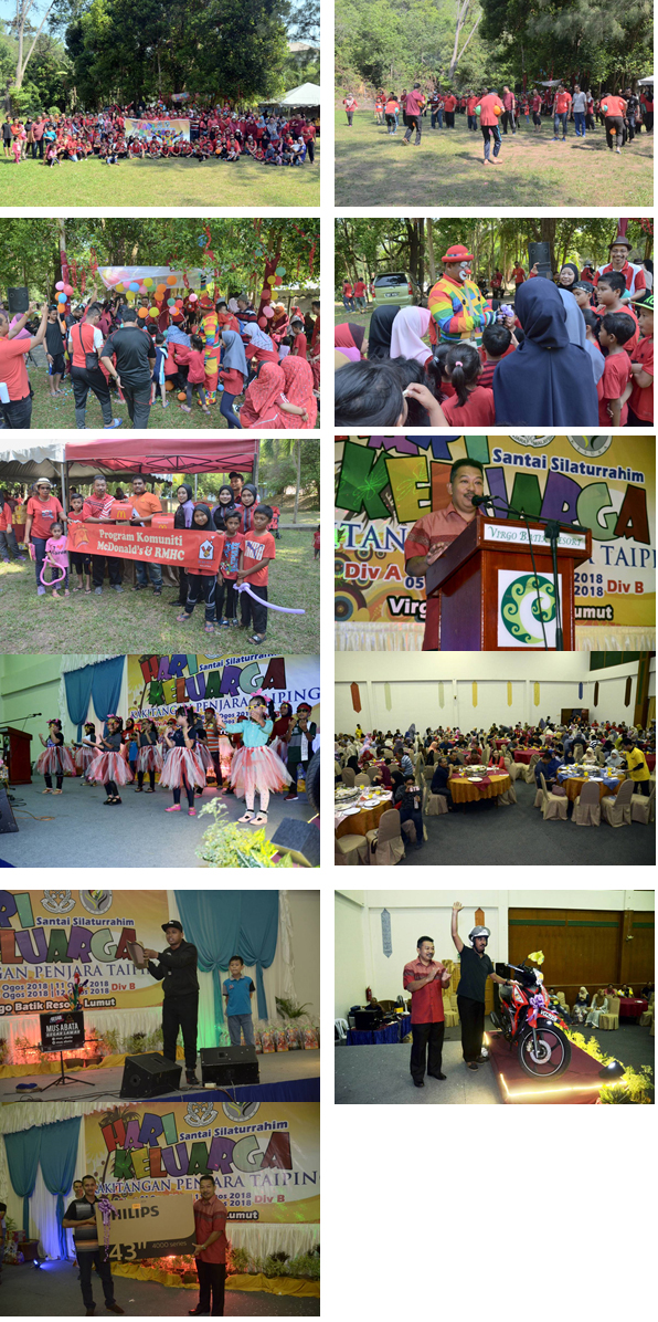 04 Ogos dan 05 Ogos 2018 Penjara Taiping telah menganjurkan Sambutan Hari Keluarga di Virgo Batik Resort, Lumut Perak bagi anggota division A. Seramai 317 ahli keluarga kakitangan telah menyertai dalam sambutan hari keluarga pada kali ini. Majlis Sambutan ini telah dirasmikan oleh PKK Charin Promwichit , Pengarah Penjara Taiping. Tujuan sambutan Hari Keluarga ini adalah untuk mengeratkan silatulrahim antara kakitangan dan keluarga, di samping diharapkan dapat memantapkan kerja berpasukan.