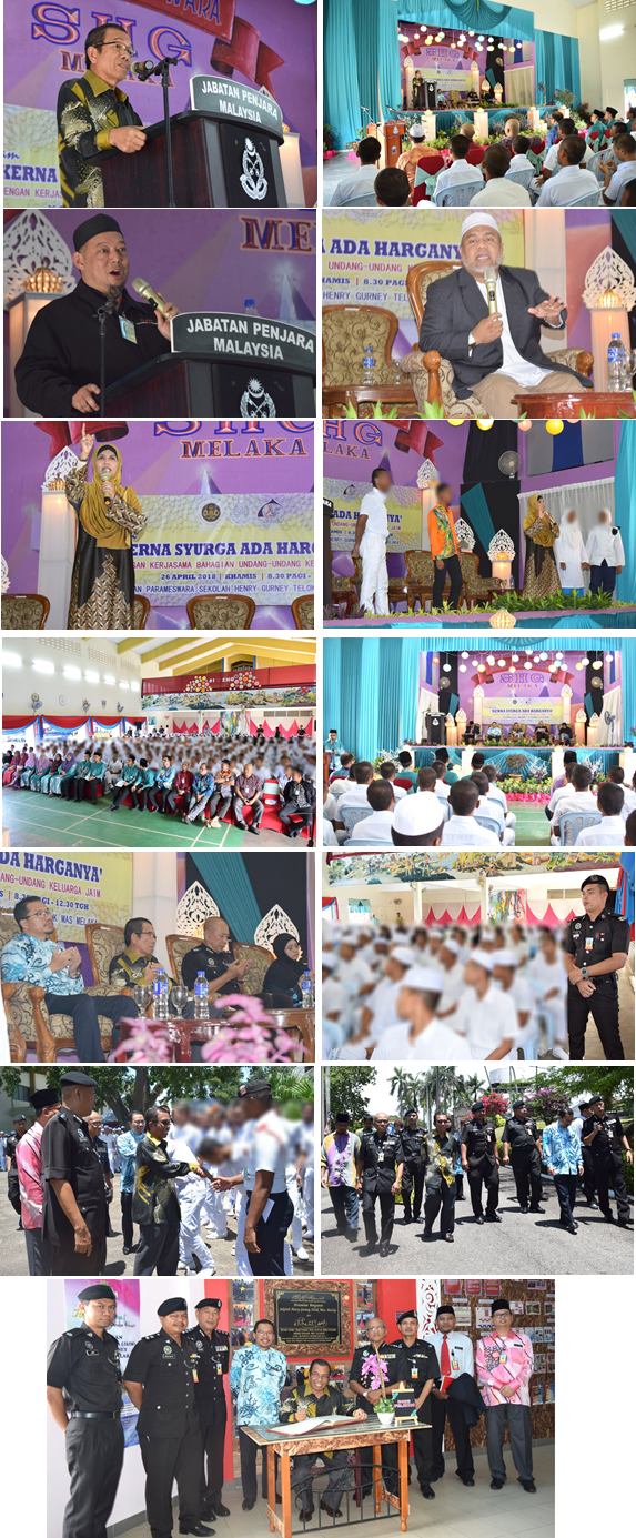 26 April 2018 (Khamis) ? Bertempat di Dewan Parameswara telah berlangsung Majlis Ceramah Perdana ?Kerna Syurga Ada Harganya? anjuran bersama Sekolah Henry Gurney Telok Mas Melaka dan Bahagian Undang-Undang Keluarga Islam Jabatan Agama Islam Melaka. Majlis dirasmikan oleh YBhg. Datuk Wira Haji Yaakub Bin Md. Amin- Timbalan Pengerusi Majlis Agama Islam Melaka yang turut dihadiri oleh KP Abdul Aziz Mohamad Pengarah Penjara Negeri Melaka. Pengisian program telah dibahagikan kepada tiga slot ceramah yang telah disampaikan oleh Al Fadhil Ustaz Hanafiah Bin Abd Malek bertajuk ?Tiada Orang Salah Yang Tiada Masa Depan?, Al-Fadhil Ustaz Amran Bollywood bertajuk ?Harga Sebuah Kehidupan? dan Ustazah Rozita Binti Abdul Hamid bertajuk ?Mengapakah Aku?? Majlis berlangsung dari jam 8.00 pagi hingga jam 4.30 petang telah dihadiri seramai 300 orang peserta terdiri daripada penghuni Sekolah Henry Gurney Telok Mas, pelatih Sekolah Tunas Bakti Sungai Lereh dan pelatih Rumah Budak Lelaki Durian Daun Melaka.