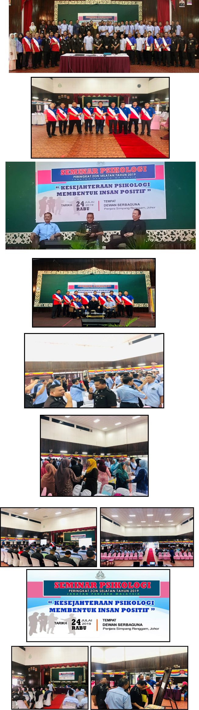 Seminar Psikologi Peringkat Zon Selatan Jabatan Penjara Malaysia telah berjaya dilaksanakan pada 24 Julai 2019 (Rabu) bertempat di Dewan Serbaguna, Penjara Simpang Renggam, Johor. Objektif penganjuran program ini adalah untuk memantapkan pembentukan kakitangan yang positif, produktif dan progresif dalam melaksakana tugas yang telah diamanahkan. Selain itu juga ia bertujuan untuk mempertingkatkan lagi budaya kerjasama, komitmen, kohesi serta toleransi di dalam organisasi dan mampu untuk membimbing kakitangan supaya dapat memberi fokus terhadap tahap kecerdasan emosi dan mental dalam melaksanakan tugas. Program ini berjalan dengan teratur dan lancar mengikut tentatif yang telah diatur. Seramai 90 orang peserta telah terlibat mewakili institusi-instusi penjara dari Negeri Johor dan Melaka. Peserta telah dipilih dikalangan Pegawai Pemulihan Institusi, Pegawai Parol, Kakitangan Awam dan ahli AKRAB institusi. Para peserta mula mendaftar seawal 8.00 pagi.
