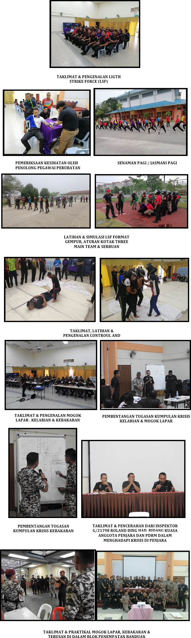 Pada 3-6 September 2019 bertempat di Dewan Budiman, Penjara Tapah. Kursus Pelan Kontingensi Rusuhan, Kelarian, Kebakaran, Tebusan Dan Mogok Lapar ini telah dijalankan selama (4) hari dari jam 7.00 pagi hingga 4.30 petang melibatkan seramai 38 peserta pelbagai pangkat, yang didedahkan dengan Light Strike Force (LSF), Controul And Restrain (C&R), Tatacara Pengendalian krisis kebakaran, tebusan, dan mogok lapar.